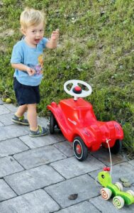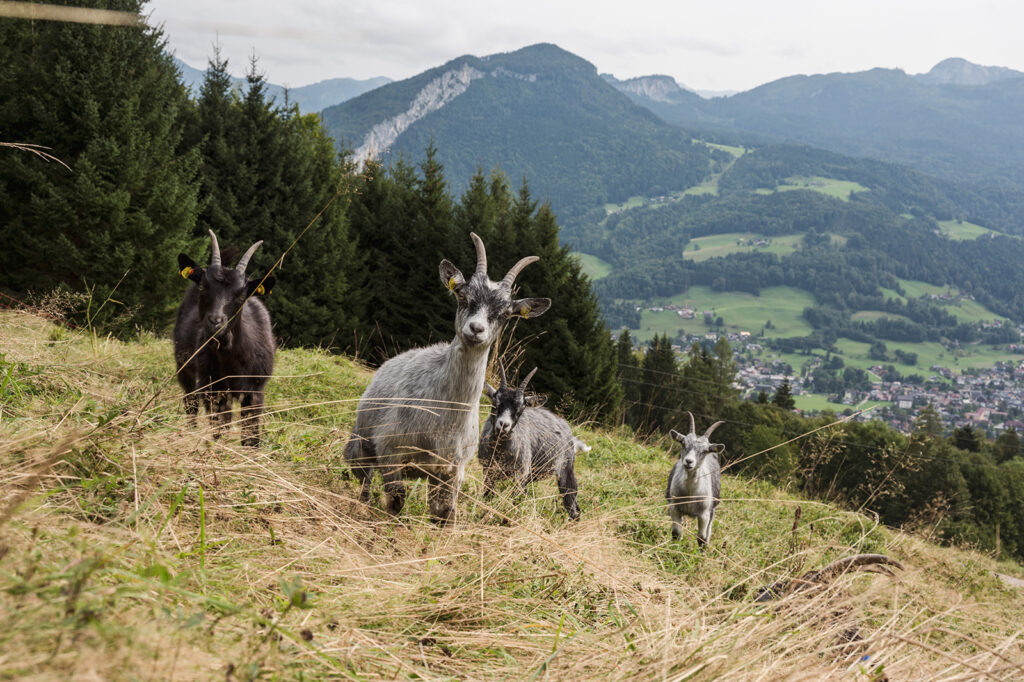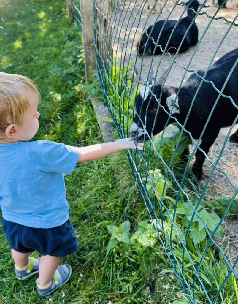 Unser Luigi, mittlerweile bald zwei Jahre alt, war im Paradies. Gleich gegenüber des Chalets leben Ziegen, die er jeden Tag mit Begeisterung beobachtet hat und auch einmal füttern durfte. Und wenn er gerade keine Ziegen gesehen hat, war er auf der Suche nach den Katzen – oder unterwegs mit seinem kleinen Bobbycar, um das gesamte Gelände zu erkunden.